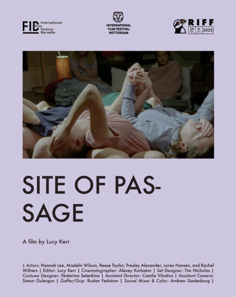 Hushed voices announce a girl’s death. Kneeling around the corpse, the teenage girls stare at her. Again, they whisper, chanting in unison “light as a feather, stiff as a board”, a magic formula from the depths of time, as they lift the body, which almost levitates. We’re in the sitting room of a house, dimly lit, candles dotted around everywhere, pop-corn spilt on the couch. Right from the start, with its motifs and set, Site of Passage evokes those teen movies portraying young witches, and horror films from the 1980s and 90s where the sleepover turns into a nightmare. In Crashing Waves (FID 2021) Lucy Kerr made the reverse side of images from genre cinema her subject matter. In this film, she applies herself to reduction, stripping her set of any horror and retaining only the invisible trace of it, suggesting it in a brief, pared-down gesture. There are no morbid tales here, just the series of mysterious motions from the six teenage girls with their angelic faces. The light- heartedness of the games they play offers a counterpoint to the fantasised horror despite a lingering and disturbing strangeness. To the creaking of the floorboards caused by girls’ movements, the minimalist sound treatment adds a continuous background noise of the film equipment, a ghostly presence in the middle of the room. A final image shows them collapsing and getting up again, supporting each other in a game of balance and counterbalance. Kerr offers a choreographic variation suspended in time, representing adolescent sisterhood in the ritualised union, like in the final scene, where the pastel colours blend into the ballet of intertwined bodies, which, in this site of passage, seem to become one. (Louise Martin Papasian)